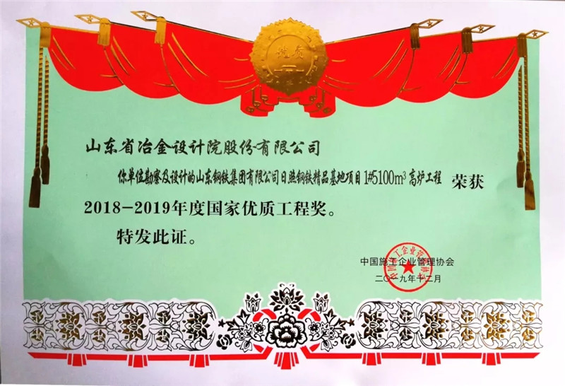 12月8日,2018-2019年度國家優(yōu)質(zhì)工程獎總結(jié)表彰大會在國家會議中心舉行,由山冶設計總體規(guī)劃、自主設計并采取“EPC”總承包模式建成的山鋼集團日照精品基地1#5100m3高爐工程喜獲國家優(yōu)質(zhì)工程獎。