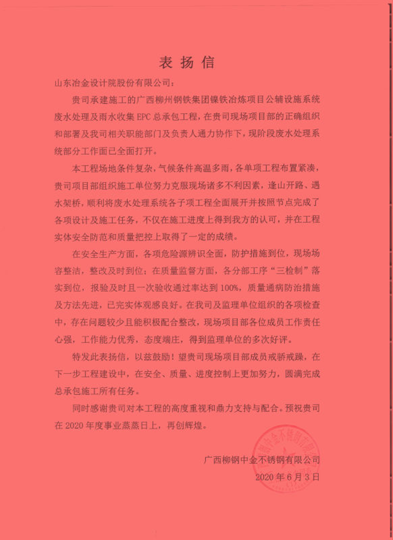 業(yè)主特此發(fā)送表揚信,一方面是對項目部目前各項工作效果與成績表示認可,另一方面對山冶設計對該項目的高度重視和鼎力支持表示感謝與贊賞!