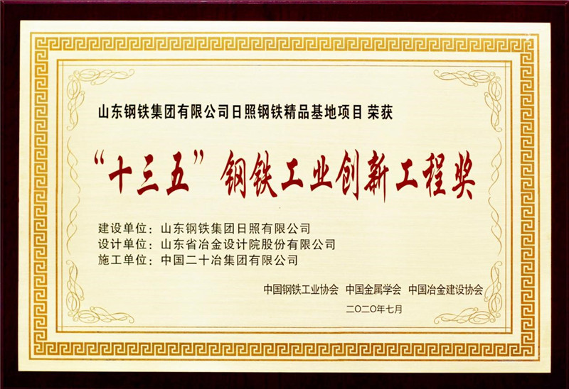 公司總體規(guī)劃設計的山東鋼鐵集團有限公司日照鋼鐵精品基地項目榮獲“十三五”鋼鐵工業(yè)創(chuàng)新工程獎
