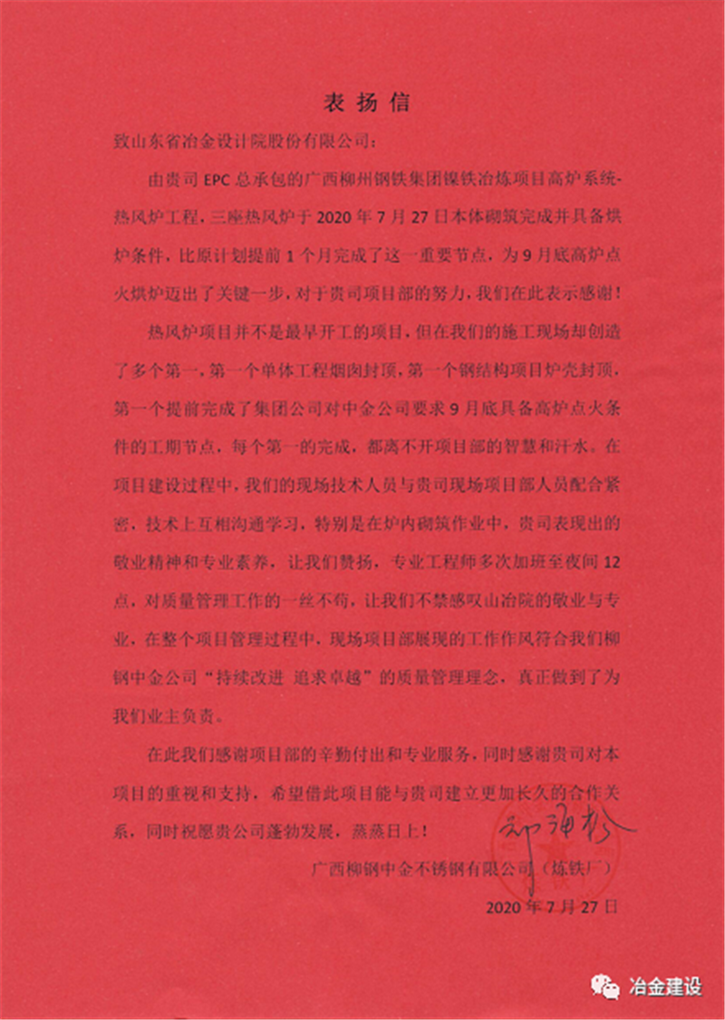 就是憑著這股韌勁和山冶設(shè)計(jì)“敢打硬仗、一切為用戶著想”的精神,柳鋼中金熱風(fēng)爐工程的各項(xiàng)工作推進(jìn)順利,并多次在安全、質(zhì)量、進(jìn)度大例會(huì)上受到表?yè)P(yáng)。在27日砌筑封頂之后,上午柳鋼中金煉鐵廠送來表?yè)P(yáng)信,對(duì)現(xiàn)場(chǎng)項(xiàng)目部的工作給予了肯定,下午柳鋼中金公司副總經(jīng)理張洪波授予了現(xiàn)場(chǎng)項(xiàng)目部“專業(yè)設(shè)計(jì)精心施工”的錦旗,盛贊山冶設(shè)計(jì)專業(yè)、敬業(yè)!