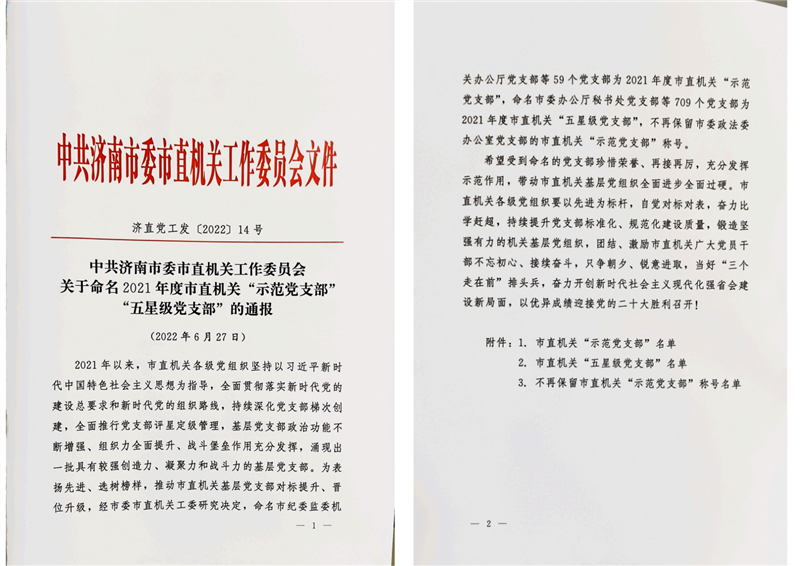 市委市直機(jī)關(guān)工委印發(fā)的《關(guān)于命名2021年度市直機(jī)關(guān)“示范黨支部”、“五星級黨支部”的通報》(濟(jì)直黨工發(fā)〔2022〕1號文)中,授予我單位熱風(fēng)爐工程技術(shù)分公司黨支部、焦化事業(yè)部黨支部、耀華能源公司黨支部、土建設(shè)計一部黨支部、土建設(shè)計二部黨支部、職能管理第一黨支部、公司辦公室黨支部、電氣設(shè)計部黨支部、經(jīng)營管理黨支部、職能管理第二黨支部共10個黨支部為“五星級黨支部”。獲獎支部將繼續(xù)發(fā)揮示范作用,團(tuán)結(jié)激勵支部黨員,不忘初心、勇于擔(dān)當(dāng),努力為公司發(fā)展做出更大貢獻(xiàn)。