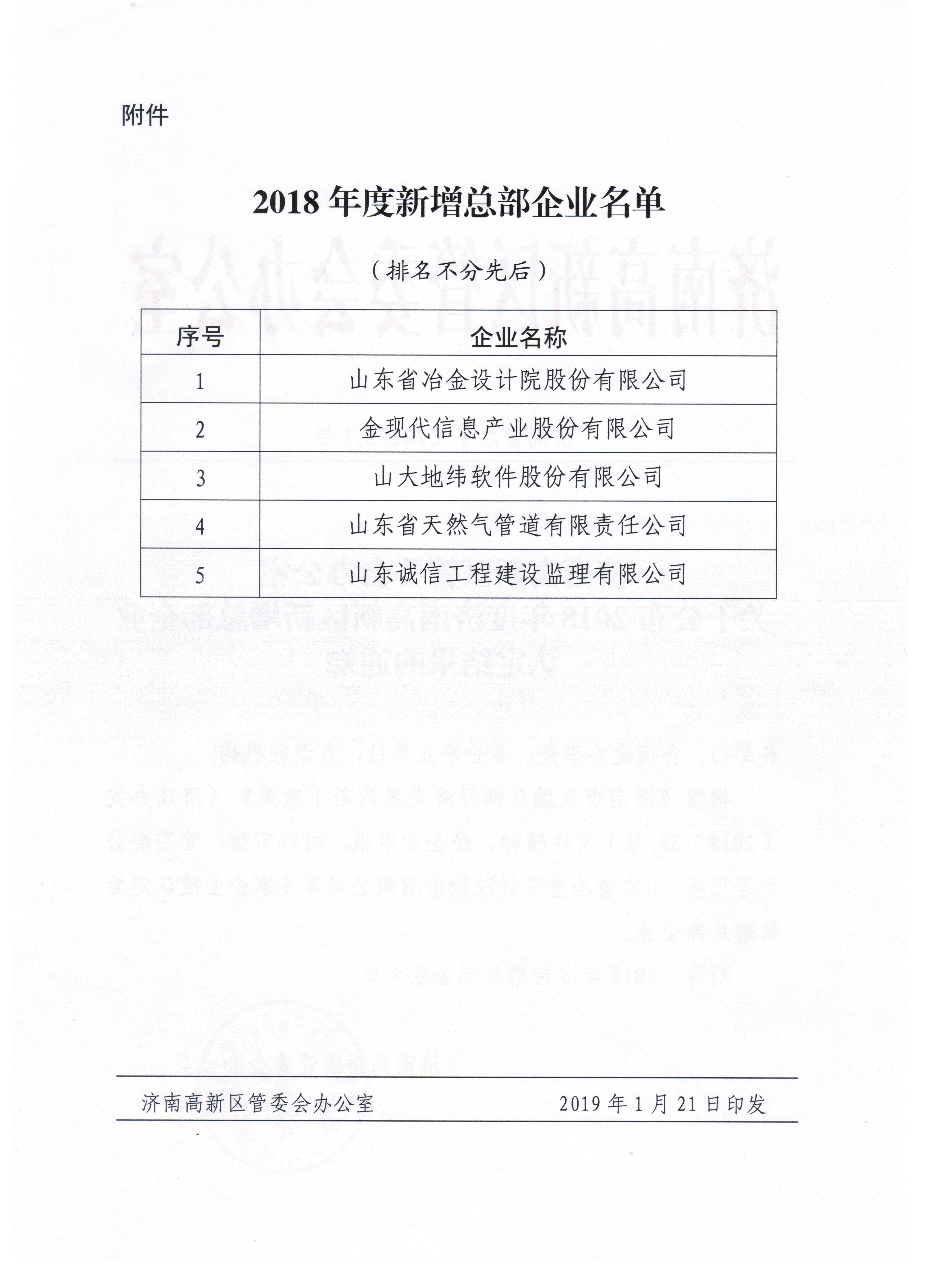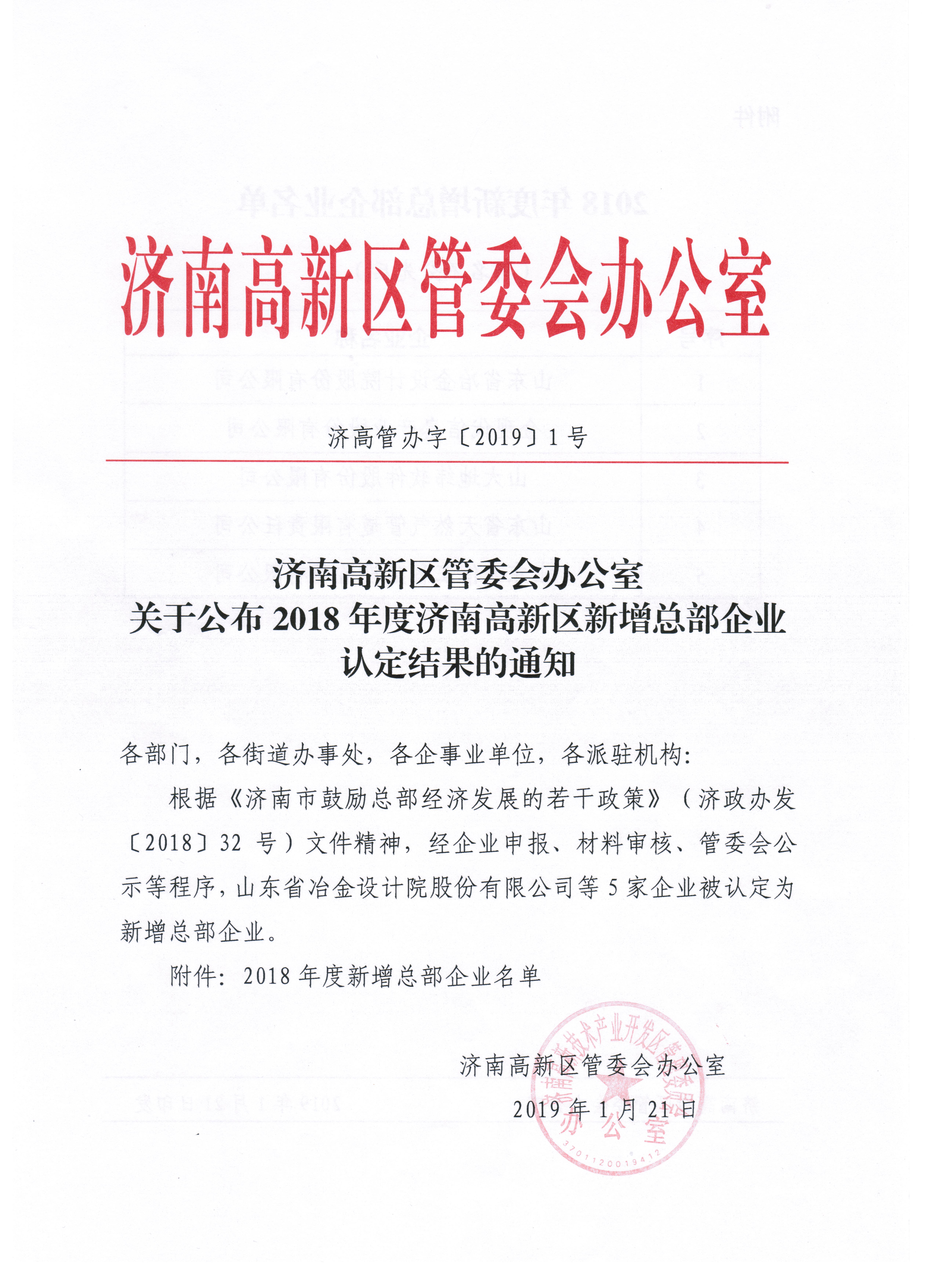 近日,山東省冶金設(shè)計(jì)院股份有限公司被濟(jì)南市認(rèn)定為首批“總部企業(yè)”。這標(biāo)志著我公司的綜合實(shí)力以及對(duì)地方發(fā)展的貢獻(xiàn)得到了濟(jì)南市政府的高度認(rèn)可。